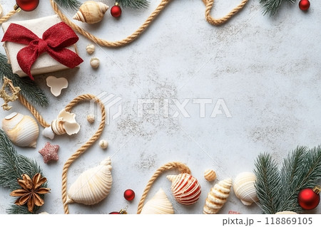 Rope, shells and Christmas decor on white grunge background. Top view