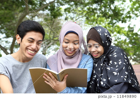 公園でノートを見る3人のアジア人