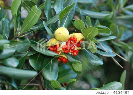 実がはじけ、赤い種が露出したトベラの木のアップ