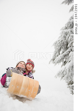 Two children sledging in snow