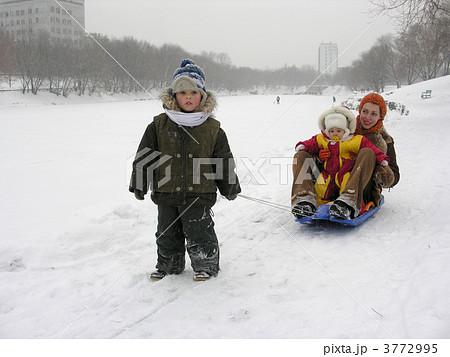 mother with children . sled. winter