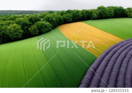 A stunning aerial view of agricultural fields creating a mesmerizing patchwork pattern of colors. The landscape features vibrant green wheat fields, golden wheat ready for harvest.