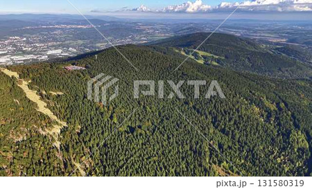 Aerial view showcases a vibrant city alongside lush green forests in a stunning landscape