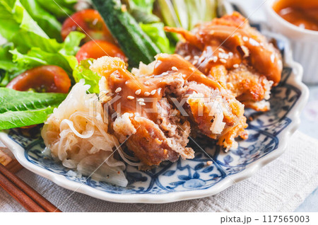 鳥肉(もも肉)のソテー、夏野菜のトマトソースかけ。