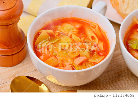 ミネストローネ、野菜のトマト風スープ、イタリアン。ジャガイモ、タマネギ、キャベツ、ベーコン、マカロニ
