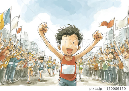 大きな旗を持って走る女子学生のポップでカラフルなイラスト