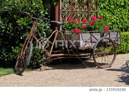 old bicycle trolley near a brick building and paver block road