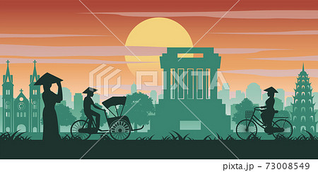 Vietnamese woman and man ride bicycle pass landmark of Vietnam,vintage color with sunset time tone