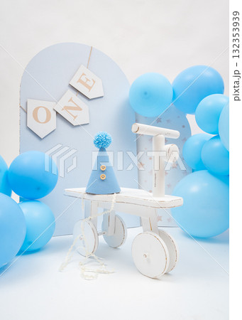Blue balloons, wooden ONE banner, and small tricycle create soft pastel first birthday setup, perfect for boys milestone celebration