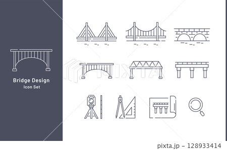 橋梁の種類と設計のベクターアイコンセット(線画・モノクロ)