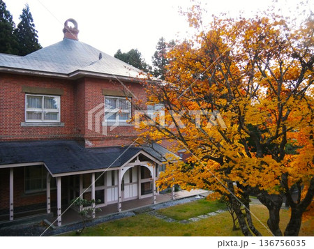 紅葉したイチョウと函館のトラピスチヌ修道院の建物