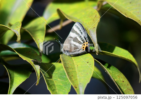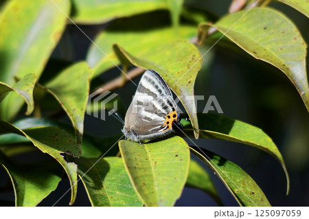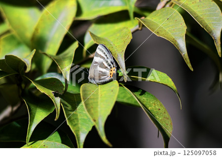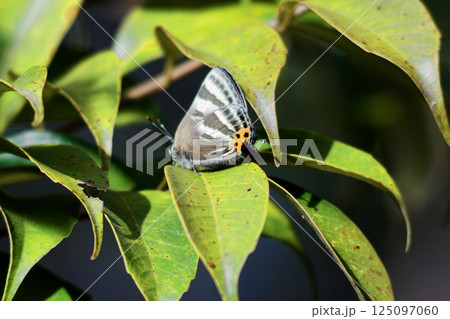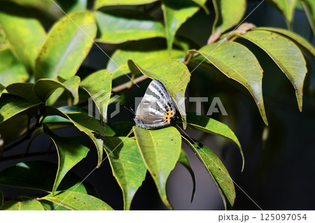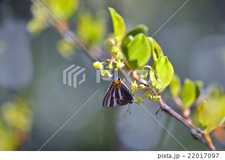 葉に止まる蛹越冬する蝶 シジミチョウ科トラフシジミ春型♂