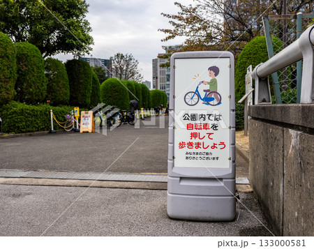 商業施設の敷地に置かれたサインスタンド「自転車は押して歩いてください」