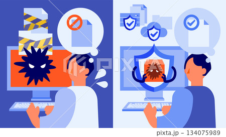 全ファイル暗号化とバックアップ復元の対比イラスト(男性)