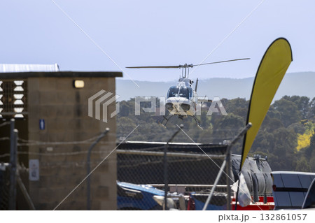 A tourist helicopter in flight around a sporting event