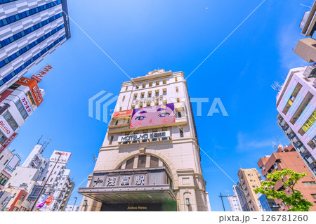 日本の東京都市景観 銀座線の車両がホーム(ドーム)の外を走る珍しい光景。新時代に希望の光=渋谷
