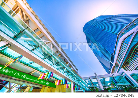 日本の東京都市景観6月22日。高輪ゲートウェイ駅前の高輪ゲートウェイシティなどを望む=令和7年