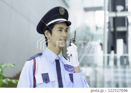 オフィスビルでトランシーバーで会話する若い警備員 撮影協力:スカパー東京メディアセンター