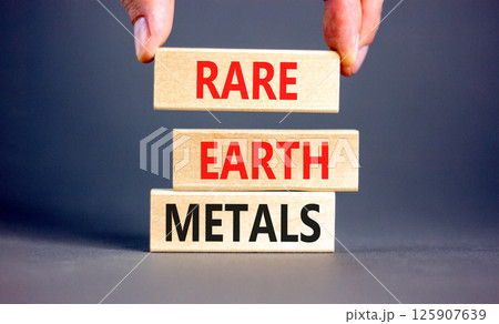 Rare earth metals symbol. Concept words Rare earth metals on beautiful wooden block. Businessman's hand. Beautiful grey background. Business and rare earth metals concept. Copy space.