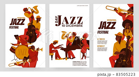 Cartoon Color Jazz Music Festival Poster Card Set Concept Flat Design Style. Vector illustration of Musicians and Musical Instruments