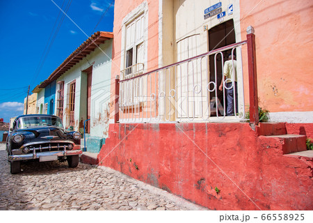 キューバ トリニダーの町中 カラフルなカサ (民泊)とクラシックカーのタクシー