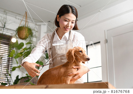 犬(ペット)のトリミングをするトリマーの若い女性