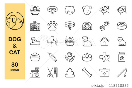 シンプルでかわいい犬や猫とおもちゃや動物病院などのアイコンセットのベクターイラスト素材/ペット/トリ