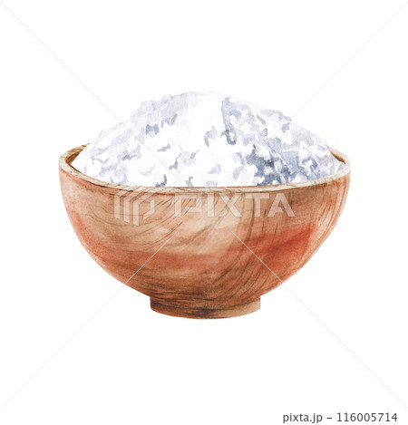 Salt in a wooden bowl in watercolor illustration on a white background. Hand-drawn illustration of salt for postcards, spa advertising, hammam. Turkish bath, Finnish sauna, beauty salons