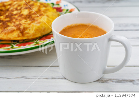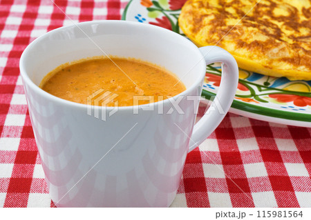 スペイン料理のトルティージャ(スペイン風オムレツ)とガスパチョ