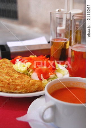 スペイン料理のトルティージャ(スペイン風オムレツ)とガスパチョ