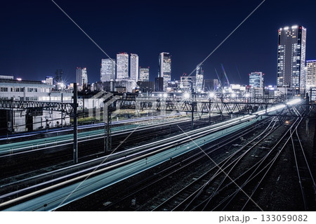名古屋市、JR東海名古屋車両区と名古屋駅のビル群の夜景