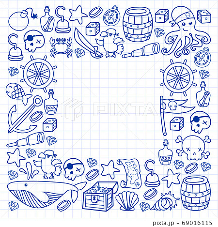 Seamless pattern on a pirate theme. Black and white graphics, handmade vector illustrations. For children s games and celebrations. For textiles, packaging, decor, wallpaper, and more.