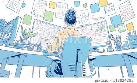 マーケティング・トレーディングデータなどの計量分析を行っている女性(シンプルな色使い)