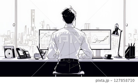 マーケティング・トレーディングデータなどの計量分析を行っている男性(シンプルな色使い)