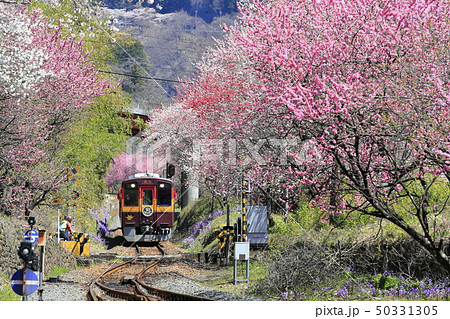 わたらせ渓谷鐵道「花桃の花咲く神戸駅付近を走る列車」