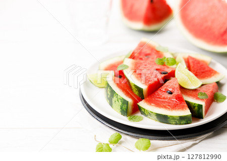 Juicy sliced watermelon with fresh green rind and mint leaf on white cloth, evoking refreshing and tempting summer snack moment