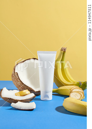 Vertical frame advertising photograph for beauty care products which extracted from natural fruits in tropical style with yellow-blue tones, an unlabeled tube surround by banana and coconut