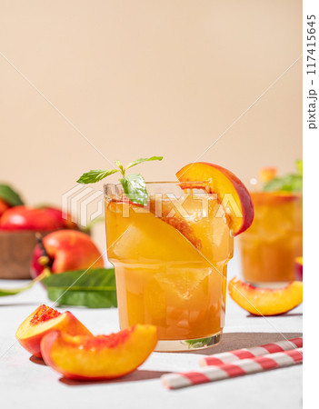 Two glasses with peach tea with ice and mint close up. Vegetarian and healthy homemade cold drink