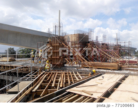 KUALA LUMPUR, MALAYSIA -OCTOBER 04, 2017: Timber formwork made from plywood and timber fabricated by workers at the construction site as the mould for a concrete structure.