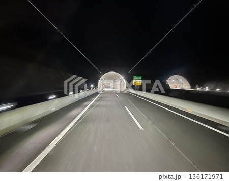 夜の高速道路を走行中 トンネルへ向かう車線と光の流れ