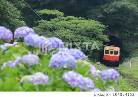 小湊鐵道「山奥のトンネルから出て来る列車」紫陽花を前景に