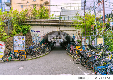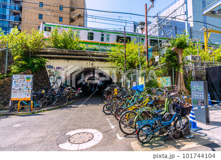 日本の東京都市景観 夏日。渋谷駅前の宮下公園駐輪場や中渋谷ガードなどを望む