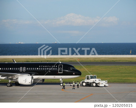 空港の夜景 トーイング中の出発便 羽田空港第三ターミナル