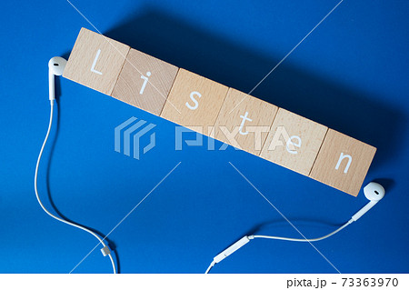 リスニング | Listenという文字が書かれた積み木ブロックとイヤホン