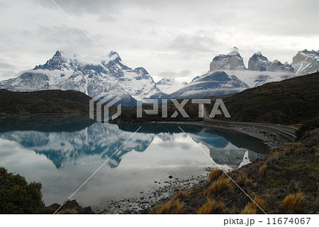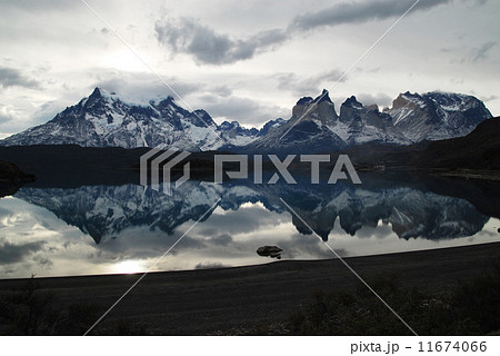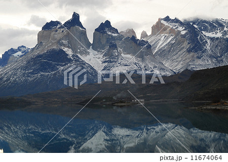 チリ パイネ国立公園 湖に映る山