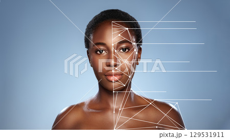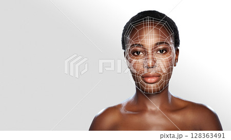Face analysis showcasing digital overlay on a model's facial features in a studio setting