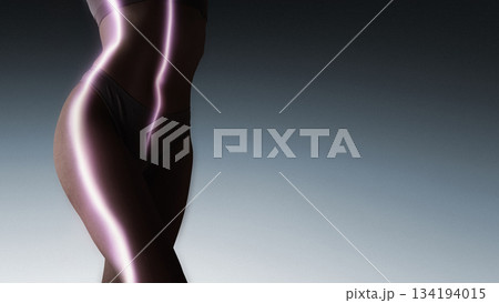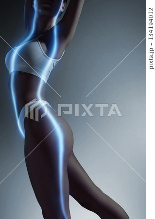 Refined collage of female body profile lit by smooth blue energy lines.