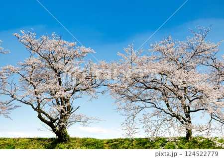 神通川さくら堤2本の桜の木と月HDRトーンマッピング