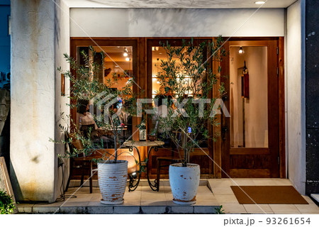 通りから客で賑わう様子が見える、夜のレストランの外観