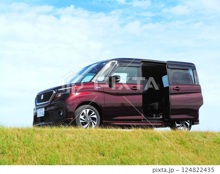 丘の上でスライドドアを開けて止まっている小型乗用車